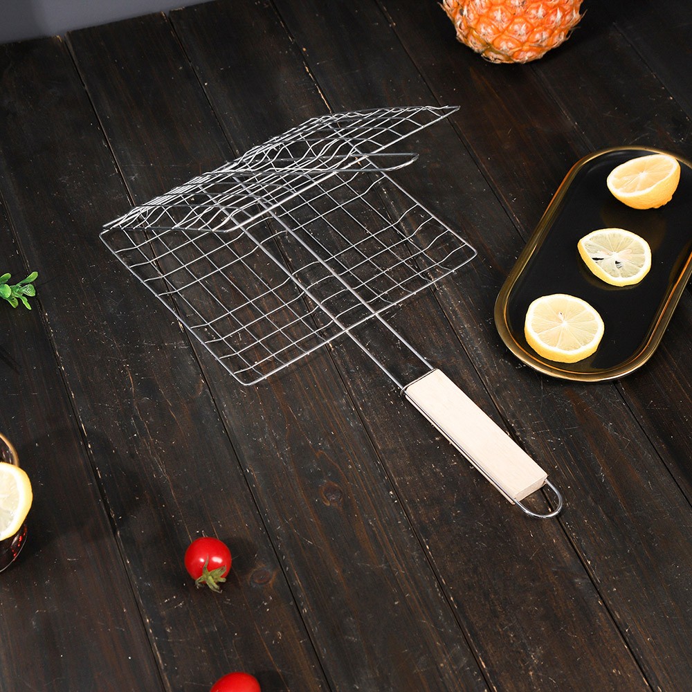 烧烤户外 烤鱼夹 工具烧烤网 方木柄多功能四汉堡烧烤夹