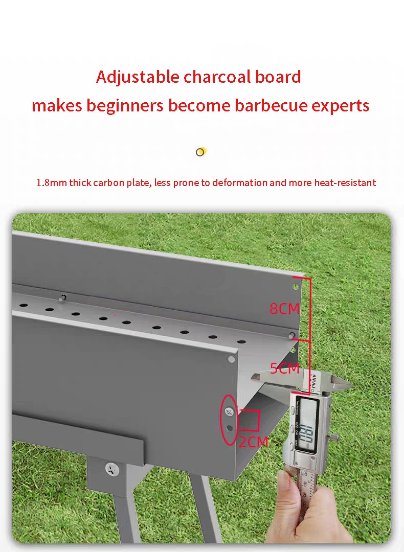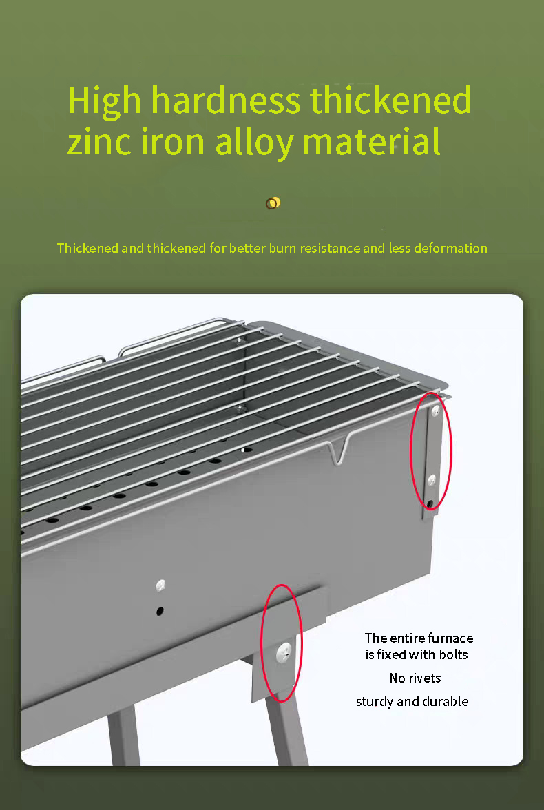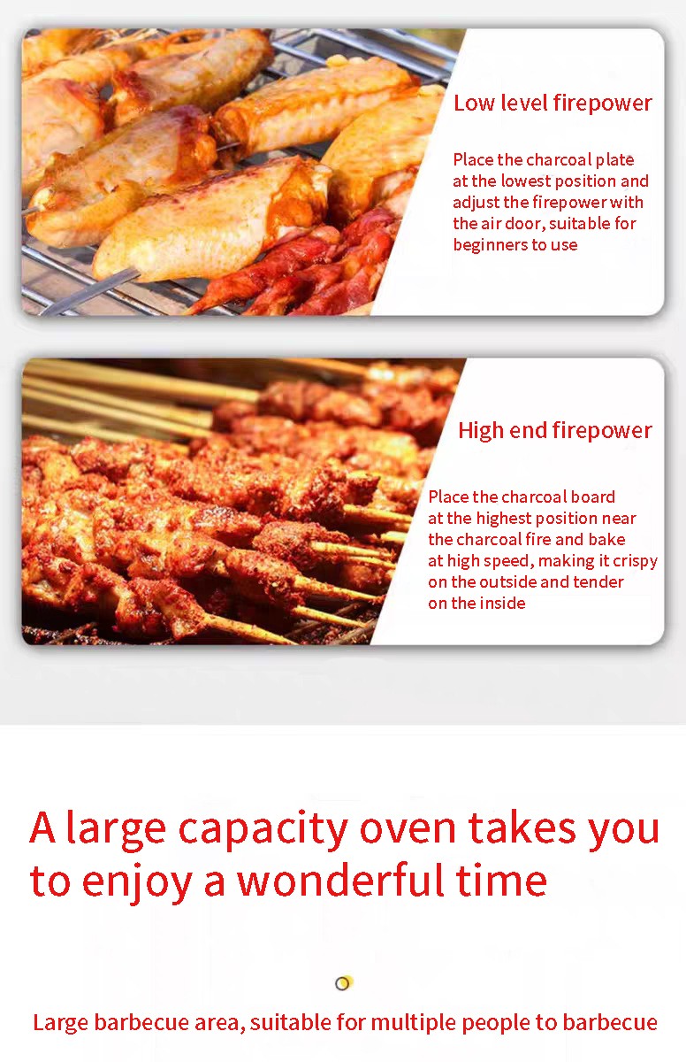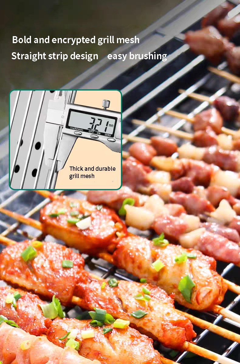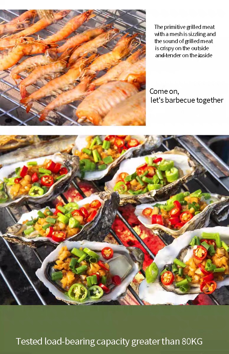 This outdoor charcoal barbecue grill has an adjustable air door, which facilitates temperature control and saves charcoal, helping to control the barbecue temperature; The grill mesh is thickened and encrypted, with a straight strip design, making it easy to wash and durable after use; The furnace body is made of high hardness thickened zinc iron alloy material, which is heat-resistant and not easily deformed; Adjustable charcoal board, novice barbecue expert in seconds, large capacity barbecue, suitable for multiple people to barbecue, coupled with high hardness support tripod, and foldable design, it is the best choice for roadside stalls and outdoor gatherings!