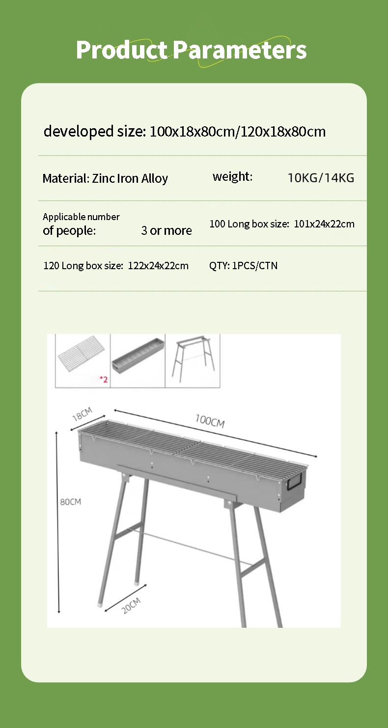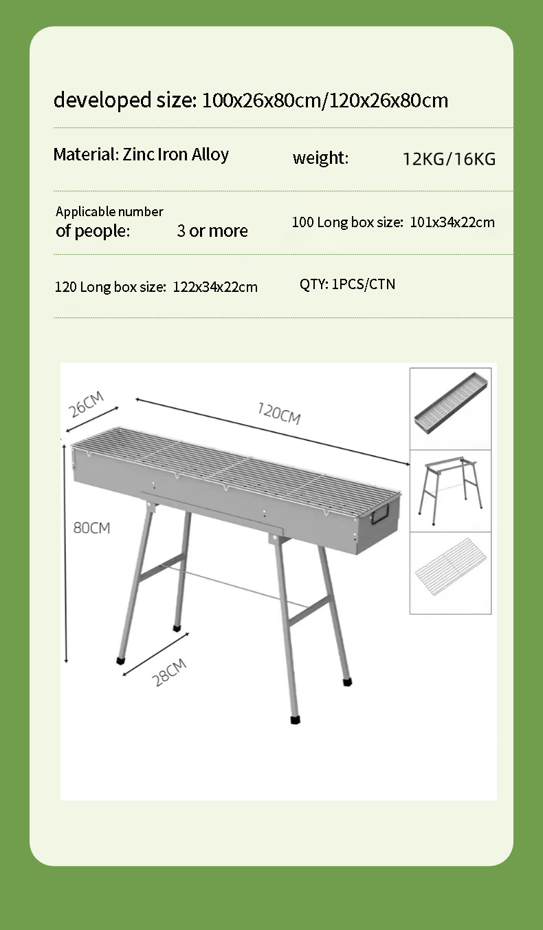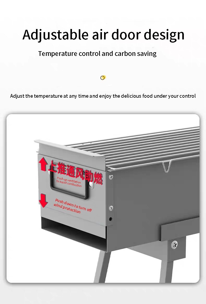 本户外木炭烧烤炉具有可调风门,方便控温省炭,助力烧烤火候掌握;烤网加粗加密,直条设计,方便使用后洗刷并能经久耐用;炉体为高硬度加厚锌铁合金材质,耐烧不易变形;可调炭板,新手秒变烧烤大神,大容量烧烤,满足多人烧烤,加上高硬度支撑脚架,还有可折叠设计,是路边摆摊,户外聚会的不二选择!